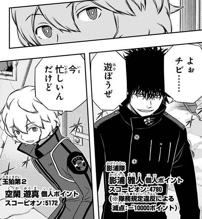 空閑は鈴鳴第一の村上に影浦隊の影浦を紹介してもらいますが、影浦は待ち合わせの場所でいざこざを起こしています。さらに、村上から影浦は人の心を読むサイドエフェクトを持っている事を聞かされます。影浦は特にA級や遠征部隊は目指しておらず、非常に好戦的で空閑に対しても挑発するような態度とりますが、空閑は気にしていないようです。