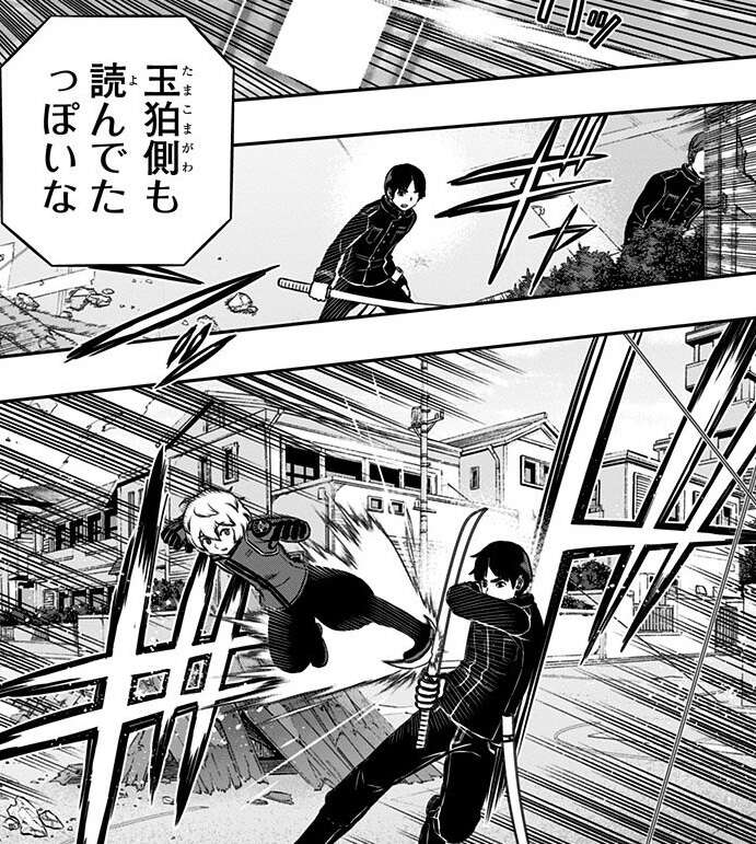 生駒隊は空閑を倒そうとしますが、空閑はワイヤーを上手く使って生駒の攻撃をかわします。その乱戦のなか、生駒隊の水上が王子に落とされます。