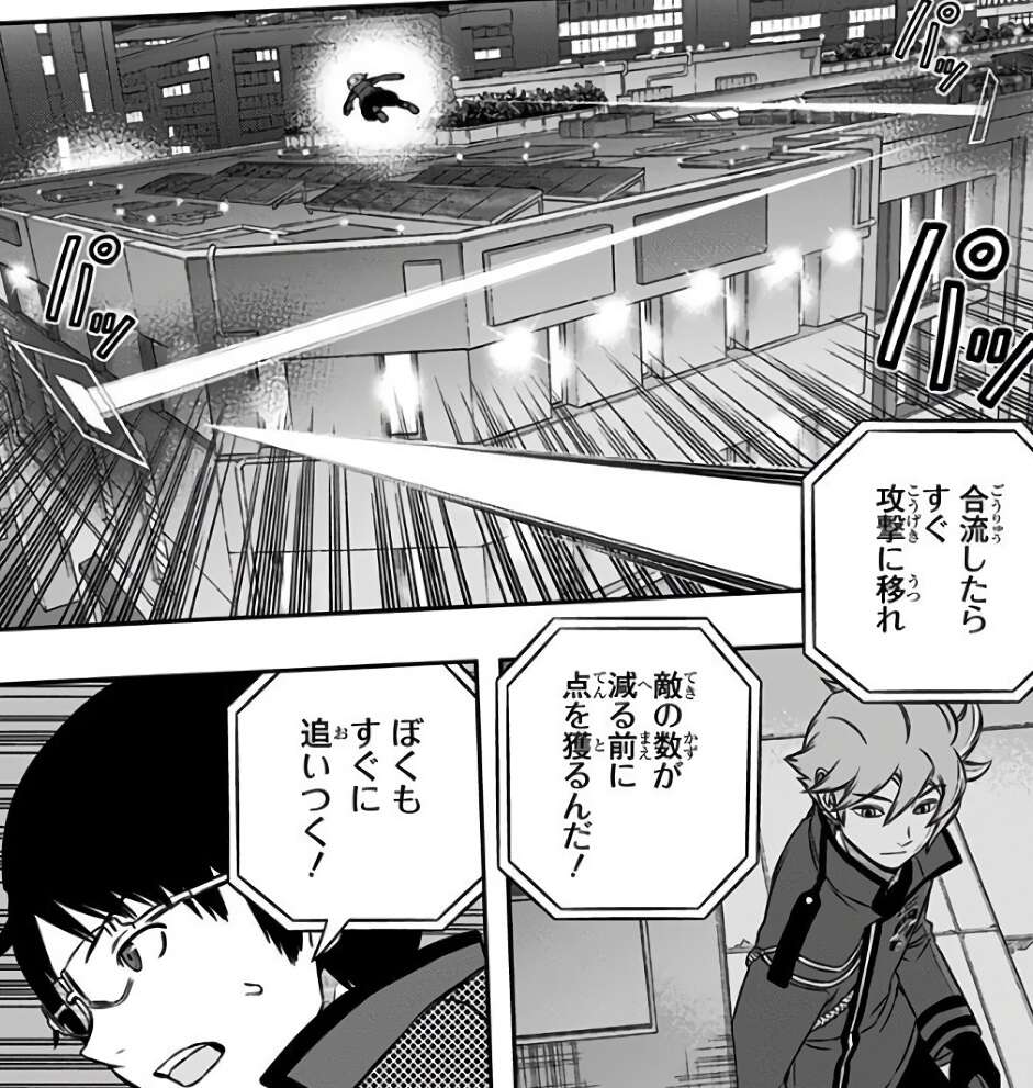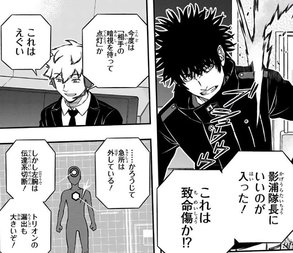 鈴鳴第一が狙っていたもう一つの作戦は、太一が1階の電気室でブレーカーをOFFにして暗闇にして奇襲し、他チームが暗闇に対応して「暗視」の視覚支援が入った頃に再度ブレーカーをONにして照明を点灯するものでした。この作戦が当たり、鈴鳴第一は影浦に致命傷を負わせる事に成功します。