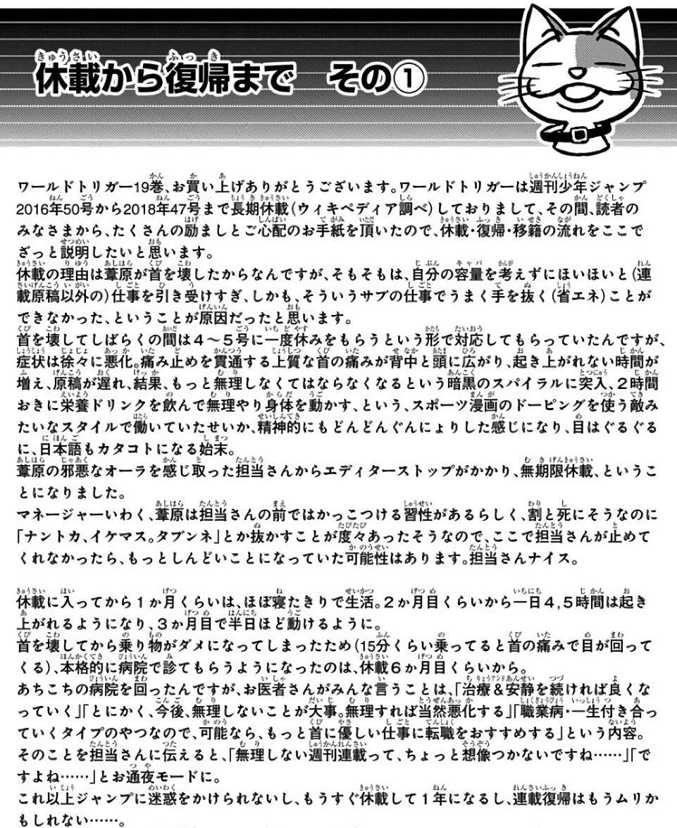 その後ある程度体調が回復し、編集部から移籍の打診があり週刊少年ジャンプで続けたいとの葛藤がありつつも、「ムリした結果ワールドトリガー絶筆」の最悪の展開もよぎったようで月刊誌へと移籍しての連載再開になったようです。詳しくは単行本に書いてある全てのいきさつを読んで下さい。