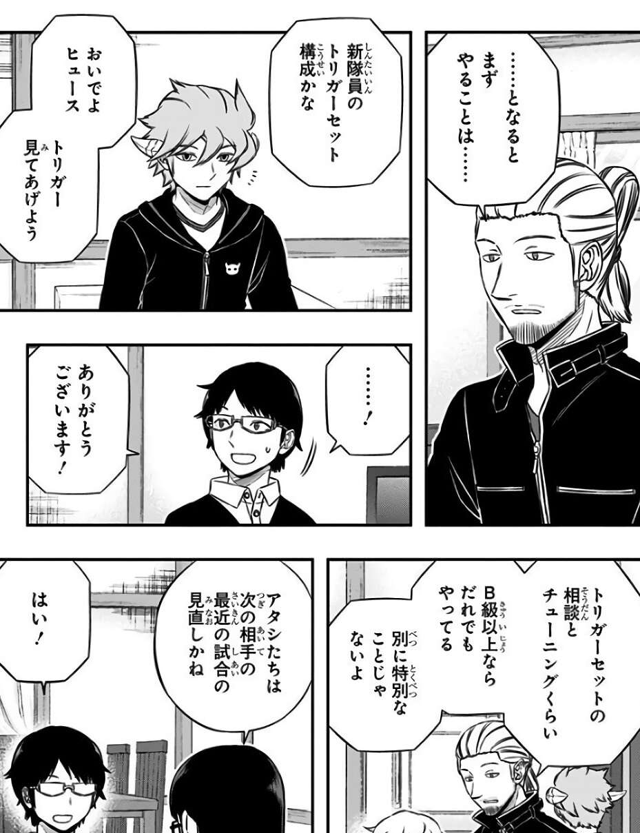 エンジニアでもあるミカエル・クローニンは、新隊員ヒュースのトリガーセット構成のアドバイスを行い、三雲と宇佐美は次の相手の最近の試合の見直しを行い、それぞれB級ランク戦 ROUND7に備えます。