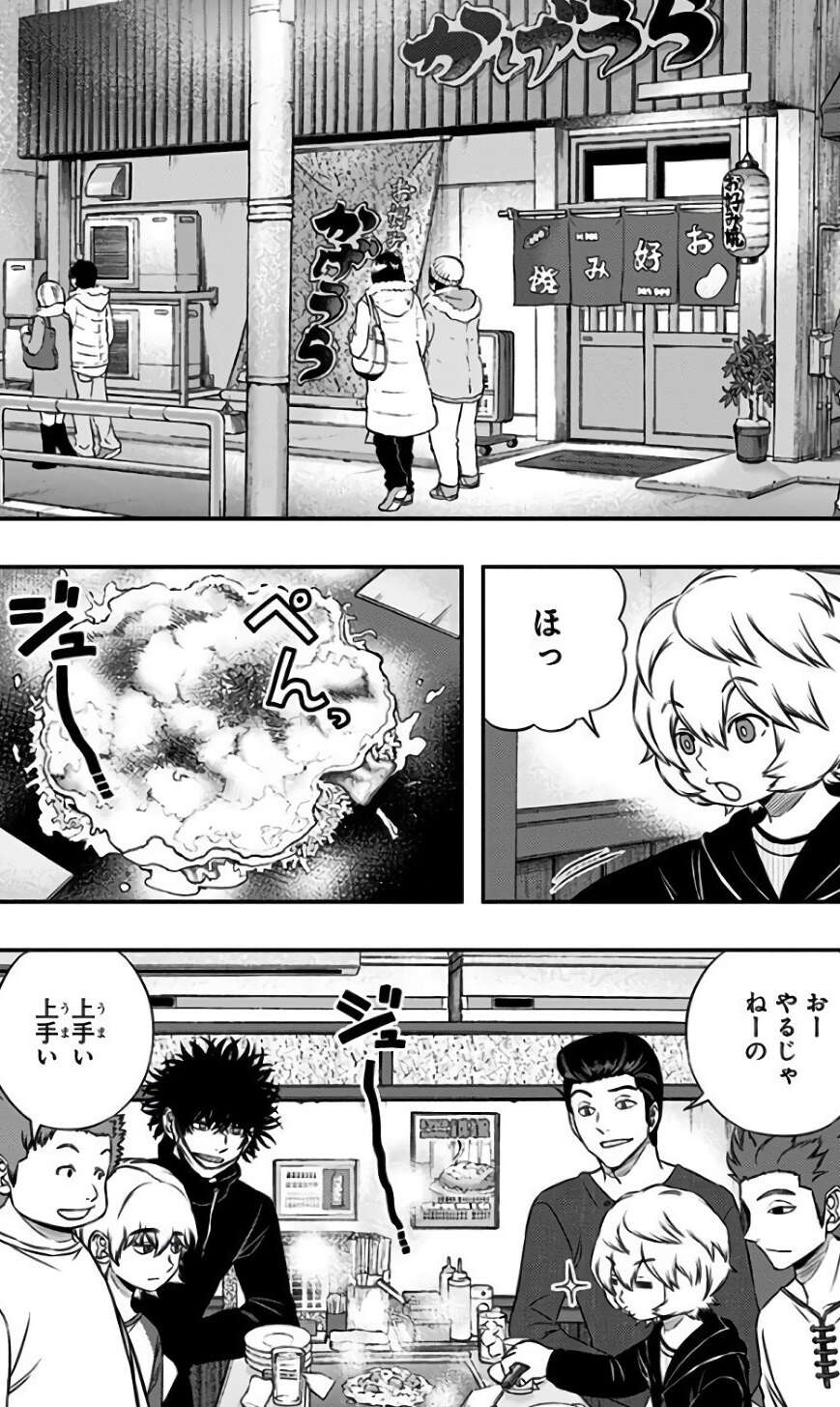 影浦隊、影浦の実家のお好み焼き屋で皆とお好み焼きを楽しむ遊真は、ユズルが千佳を気にしていると言う話から、ユズルが次のB級ランク戦 ROUND7でわざと負けるという話を聞きます。ユズルが所属する影浦隊は遠征を狙っている訳ではないので、真剣に遠征を狙っている人に譲った方がいいと言う考えです。しかし遊真は既に千佳は既に遠征行きが決まっている事実を、ユズルに話します。