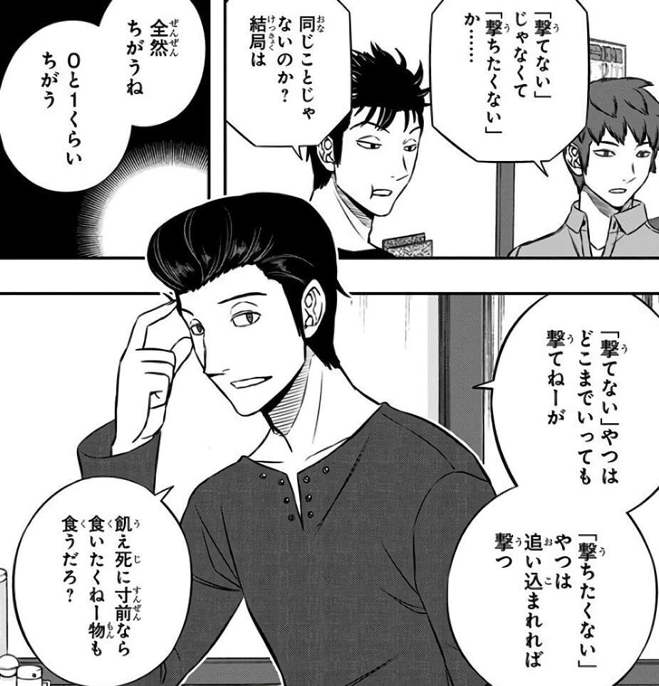 話変わって、A級の当真から千佳が人を撃てない事を指摘され、遊真はとぼけますが多くの人にバレバレでした。しかし当真は千佳が人を撃てないのではなく、人を「撃ちたがらねえ」やつだから、追い込まれれば撃つと断言します。