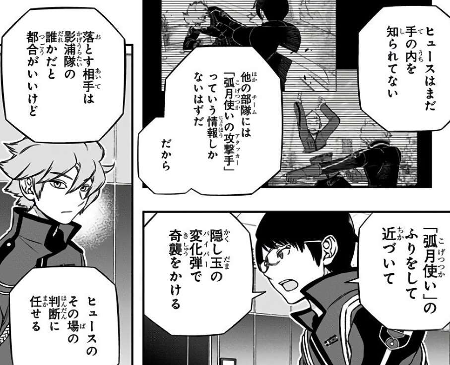 不安から迷っていた三雲ですが、ヒュースに促され全員に序盤の作戦を伝えます。まず今回は「ワイヤー陣」は狙わない方針です。MAPが狭く建物が大きいのでワイヤー陣を張れる場所が少なく、敵部隊にそれぞれ狙撃手がいてワイヤー陣の外から反撃される可能性が高いからです。逆に玉狛第2の有利な点、手の内が知られていないヒュースで序盤に敵を仕留める考えです。