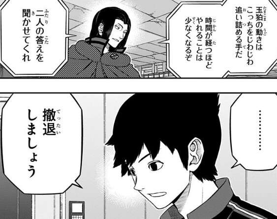 雨取のおかげ?でダミービーコンを削れて、東隊の奥寺もついでに倒されます。玉狛第2は数的にも有利になり、東隊の逃げ道を塞いでどんどん追いつめていきます。東隊も玉狛第2の狙いには気付いていて、その上でこのまま戦っても勝算は低いと判断し撤退を狙います。