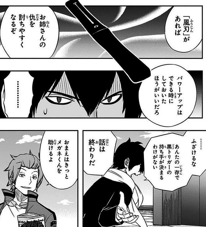 結局、三雲は風間相手に連戦連敗してしまい三雲自身も諦めかけますが、迅が自分たちのために黒トリガーを本部に献上してくれたと聞き、せめて一矢報いようと最後の一戦を挑みます。烏丸に教わった自分に今ある武器、「アステロイド」、「シールド」、「レイガスト」、「スラスター」、これらで戦術を組み合わせ風間に挑みます。