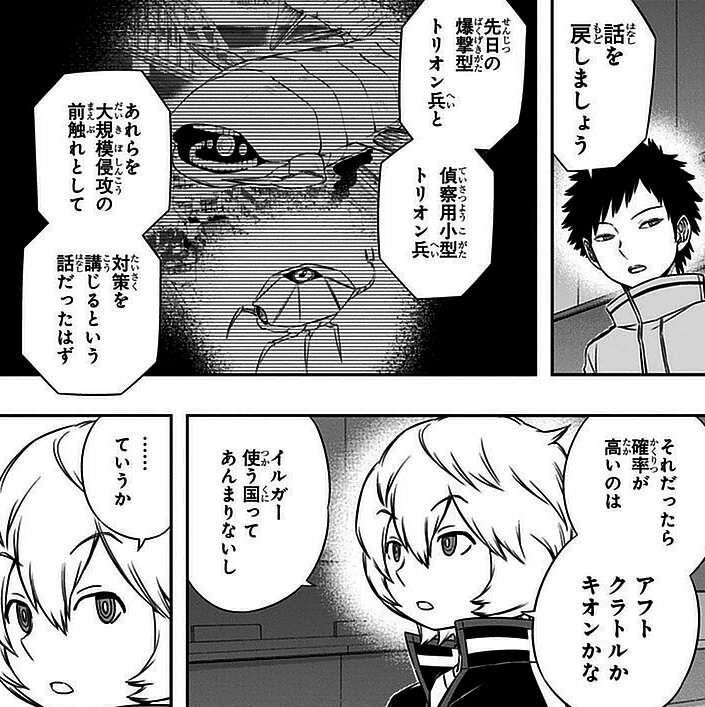 レプリカは城戸司令に空閑の安全と権利を保障させることと代わりに、自身が持っている近界民(ネイバー)の情報を提供します。レプリカの持つ近界民(ネイバー)の情報から、こちらの世界に近づいてきているのは惑星国家では、リーベリー、リオフォリオ、キオン、アフトクラトルの4つに絞られます。さらに空閑は、先日のトリオン兵イルガーを使う国に限定し、アフトクラトルかキオンが攻めてくる確立が高いと予想します。