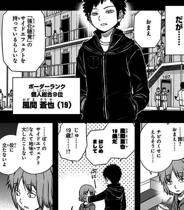 基地東部で戦っている風間隊の菊地原史郎のサイドエフェクトは「強化聴覚」ですが、一言で言うと「耳がいい」というだけの能力で、菊地原自身も指摘されるまでそれをサイドエフェクトと気付いていませんでした。菊地原本人も自身のサイドエフェクトをショボいと思っていましたがその頃に、風間隊の隊長 風間蒼也から、「強化聴覚」のサイドエフェクトを持っている事を理由にチームに勧誘されます。