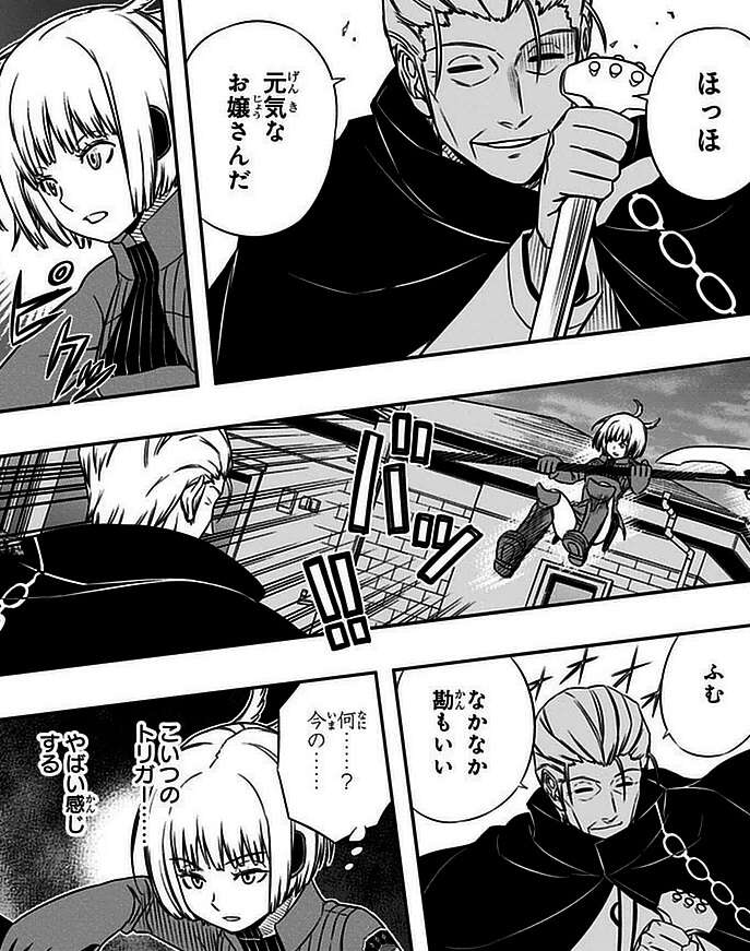 雨取千佳がアイビスで撃った一撃で新型のラービットが倒されたのを見て、アフトクラトルの司令官、ハイレインは「金の雛鳥」か、と言い作戦変更して、ランバネインとエネドラを予定通り「門」に投入し、ヴィザとヒュースに「金の雛鳥」を追うように言い、雨取千佳を捕獲しようとします。