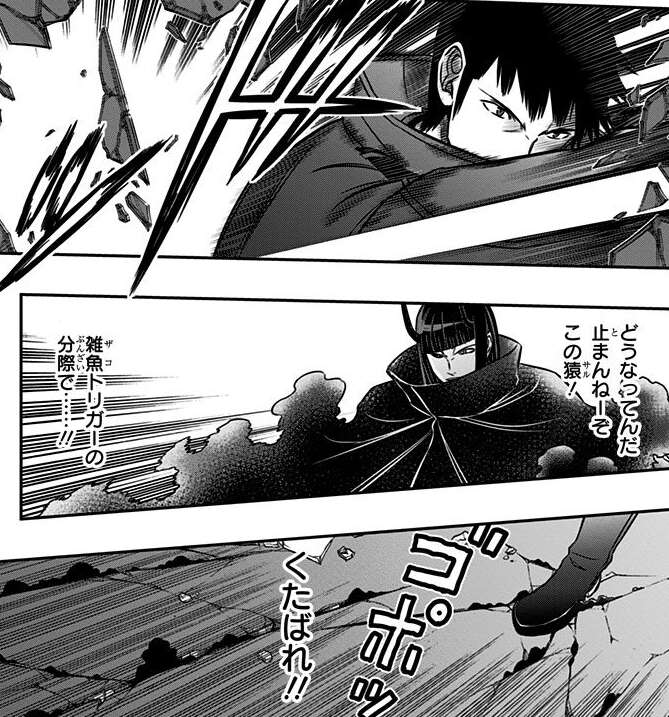 空閑はヴィザ相手に勝ち目は薄いですが、逃げるわけにはいかないと空閑はまず相手を奇襲するため、「響」印を使い下から攻撃します。しかし、ヴィザは「星の杖」に対して足元からの死角から攻撃してくるのは予想通りのようで、全くダメージを受けていません。