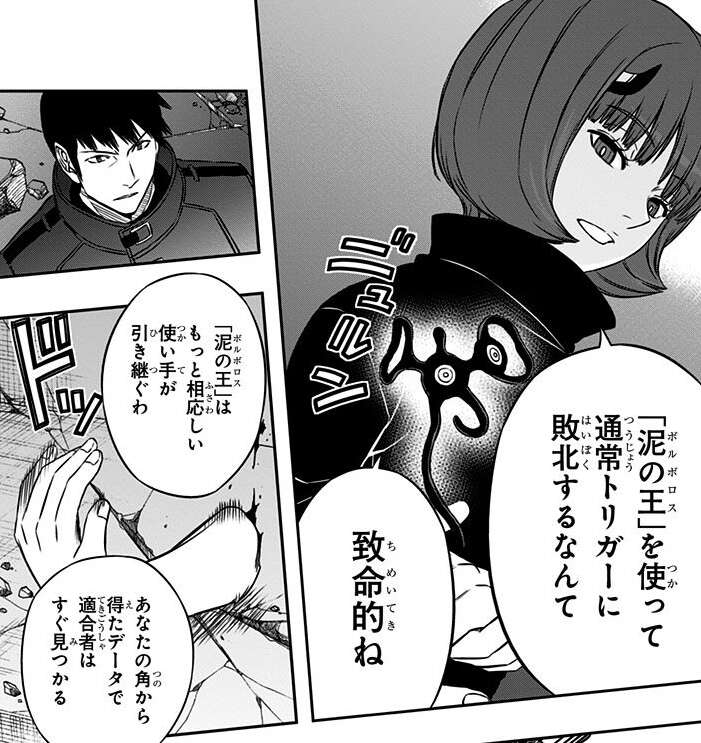 篠田本部長と風間隊の功績でエネドラを追い詰めますが、アフトクラトルのミラによってエネドラは殺されて、「泥の王(ボルボロス)」を回収されてしまいます。仲間を殺したアフトクラトルに驚きますが、忍田本部長の指示でエネドラの亡骸を収容します。