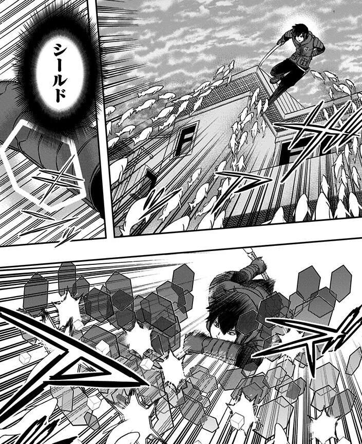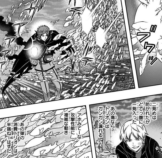 三輪はハイレインに対して正面から一対一で戦います。しかし、ハイレインの弾丸は生き物の形をしていて、ボーダーが使うトリオンの弾丸やシールドと同じく三輪の弾丸を防げません。さらに三輪は攻撃を防ぎつつ、ハイレインに斬撃を食らわせます。